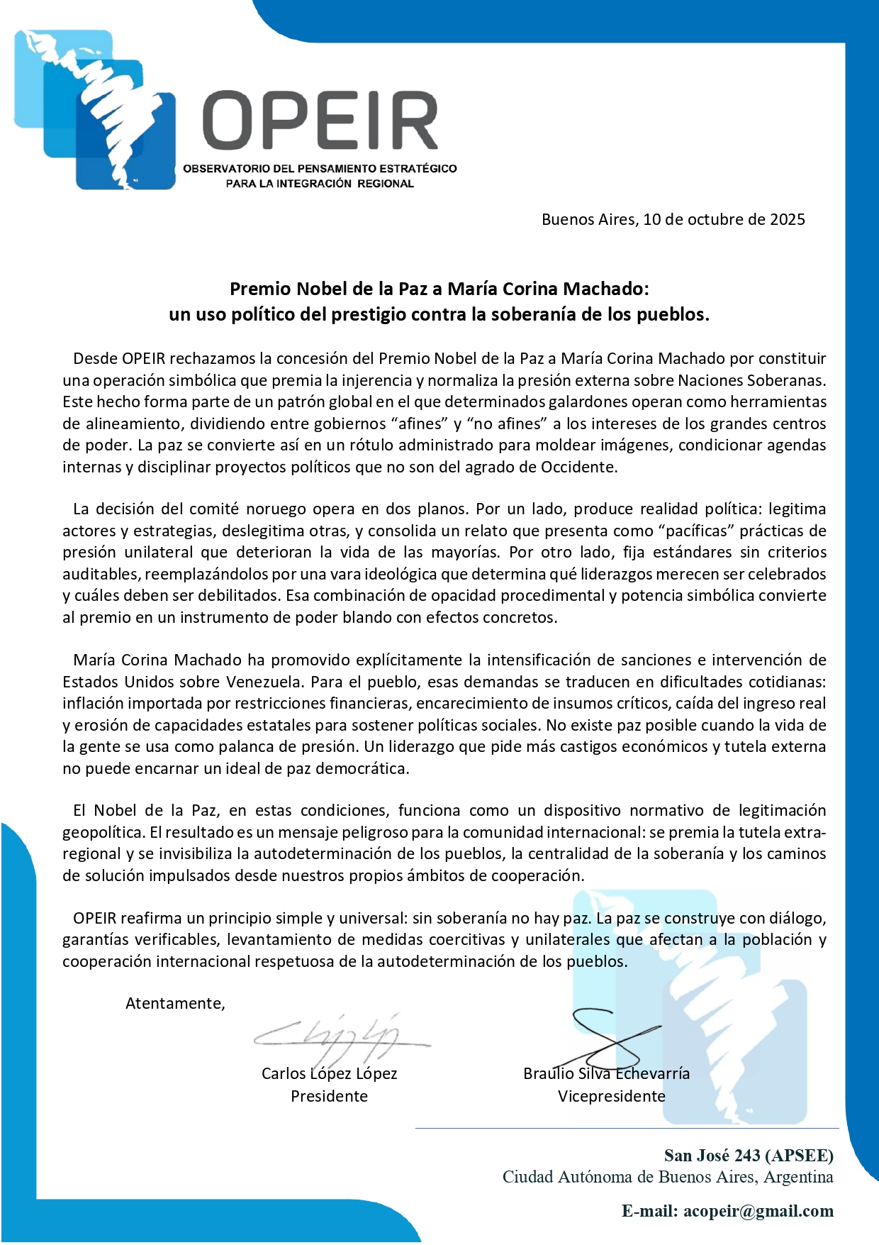 Inicio Comunicados y Noticias Repudio al premio Nobel de la Paz a Maria Corina Machado Repudio al premio Nobel de la Paz a Maria Corina Machado FacebookTwitterWhatsAppEmailTelegram